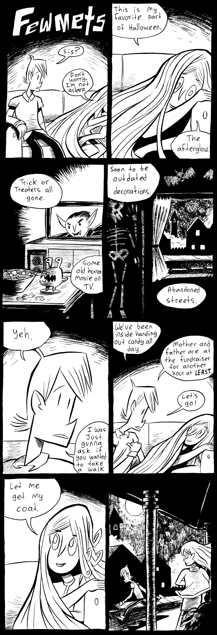 I’m still new to this black and white thing so bear with me. This is the first part of my Halloween special! You might see a familiar face in this comic. You might even see two if you’re one of the three people in the world who read the original Fewmets.